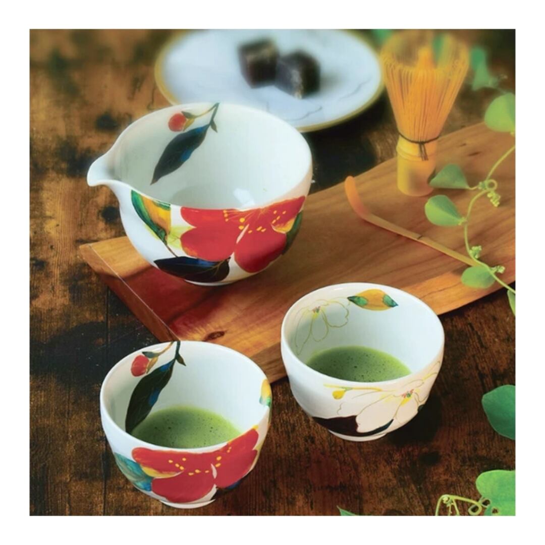 山茶花と木蓮のデザインが施された品々が、心を和ませ、日々のお茶の時間を豊かに演出。また味わい深い抹茶を引き立てる形状は、どんなテーブルセッティングにも調和し、上品さを添えます。